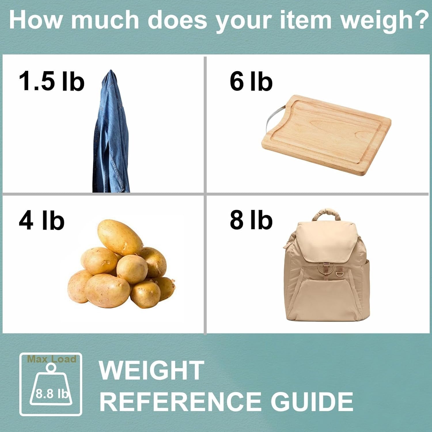 Heavy-Duty Hold – Up to 8.8 lbs Strong self-adhesive design holds coats, towels, keys, bags, hats & more without falling. Perfect for kitchen, bathroom, bedroom, or hallway.